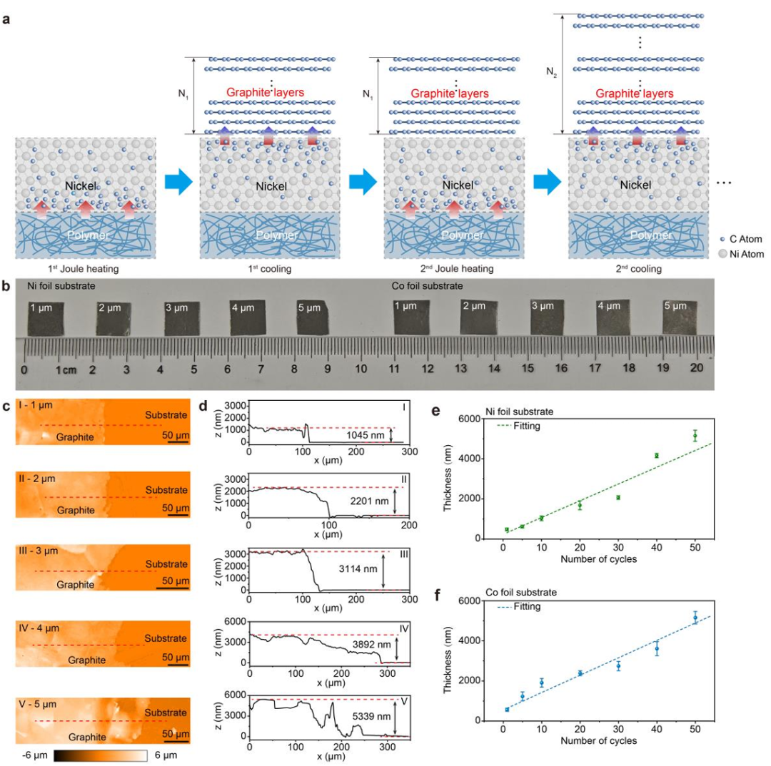 图3展示了通过循环脉冲工艺突破单次生长厚度限制的策略。a,循环加热-冷却工艺示意图,每个循环包括碳溶解(加热)和石墨析出(冷却)两个阶段。b,通过调控循环次数(1-50次),在镍箔和钴箔上均可获得1-5微米厚的连续石墨薄膜。c,d,白光干涉(WLI)表征清晰地展示了不同循环次数下石墨薄膜的台阶边缘及对应的厚度变化。e,f,对镍(e)和钴(f)基底上的石墨厚度进行统计分析,发现厚度与循环次数呈现良好的线性关系,实现了对微米级厚度的精准调控。尽管每个循环的净增厚(~0.1 μm)低于单次极限,但2小时内制备5 μm厚薄膜的效率仍远超传统方法。