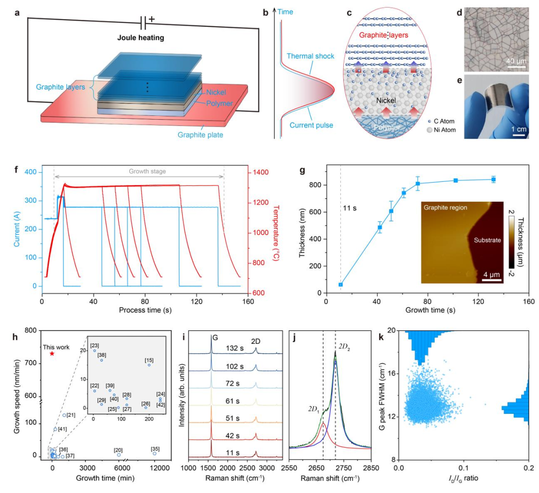 图1系统展示了PJHIC策略的设计思路与核心优势。a-c, PMMA固体碳源涂覆于镍箔上,通过脉冲电流产生瞬时焦耳热(b),实现碳源快速分解及碳原子向金属基底的体相扩散;随后的快速冷却触发碳的强制析出(c),在金属表面形成高质量石墨薄膜。d,e,所制备的石墨薄膜可无损转移至Si/SiO₂及柔性PET基底,展现出良好的连续性与柔性。f,g,通过精确调控脉冲电流(f)来改变生长时间,发现石墨厚度在72秒后趋于饱和(~800 nm),并在61秒时计算得出高达730 nm/min的垂直生长速率(g)。h,与文献对比,PJHIC策略在生长速率上展现出压倒性优势(高出一个数量级)。i-k,拉曼光谱(i)及统计分布(k)显示,所制备的石墨薄膜具有极低的缺陷密度(ID / IG≈ 0.03)和尖锐的G峰(半高宽 ≈ 13 cm⁻¹),2D峰的双洛伦兹拟合(j)则证实了其完美的ABA堆垛结构。