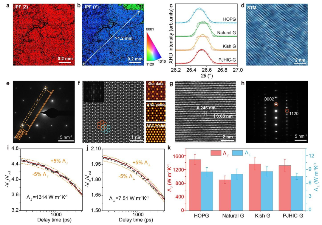 图4综合运用多种表征手段,证实了PJHIC石墨薄膜与商用高品质石墨相当的结构完美性。a,b,电子背散射衍射(EBSD)显示薄膜具有面外高度一致的(0001)取向(a)和毫米级的面内晶粒尺寸(b)。c,高分辨X射线衍射(XRD)显示PJHIC石墨的(0002)峰位于26.543°,其半高宽(0.169°)和计算所得层间距(3.355 Å)均与HOPG、天然石墨及Kish石墨高度吻合。d-f,扫描隧道显微镜(STM)(d)、选区电子衍射(SAED)(e)和环形暗场扫描透射电镜(ADF-STEM)(f)从原子尺度共同证实了薄膜的ABA堆垛结构。g,h,截面高分辨透射电镜(HRTEM)图像清晰显示了石墨的层状结构及0.68 nm的c轴周期。i-k,时间域热反射(TDTR)技术测得PJHIC石墨的面内热导率达1314 W m⁻¹ K⁻¹(i),跨面热导率为7.51 W m⁻¹ K⁻¹(j),其综合导热性能与HOPG和Kish石墨相当(k),证明了快速生长并未牺牲材料的本征热学性能。