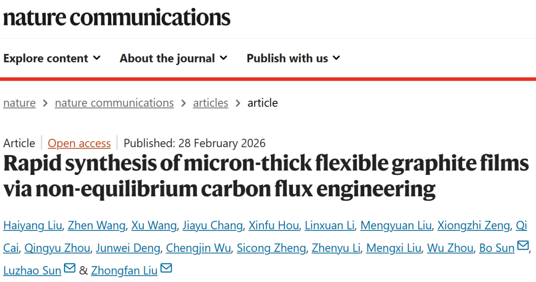 2026年02月28日,北京大学与北京石墨烯研究院刘忠范院士、孙禄钊特聘研究员及清华大学孙波副教授在期刊Nature Communications上发表了题为“Rapid synthesis of micron-thick flexible graphite films via non-equilibrium carbon flux engineering”的研究论文。本研究提出了一种“脉冲焦耳热诱导渗碳”(PJHIC)的非平衡合成策略。该策略利用快速电热冲击(>1300°C,>300°C/s加热速率)在金属基底(镍、钴)中创造瞬态非平衡状态,极大地加速了碳原子的体扩散与析出过程。研究发现,利用快速降温驱动的碳强制析出过程,可实现高达4.5 μm/s的瞬时碳输运速率,从而在61秒内实现了厚度达730 nm的石墨薄膜的垂直生长,速率较传统方法提升了一个数量级。通过循环脉冲工艺,团队成功制备了1-5微米厚、毫米级晶粒尺寸的ABA堆垛高质量石墨薄膜,其热导率(1314 W m⁻¹ K⁻¹)与结晶度均可与商业HOPG和 Kish石墨相媲美。