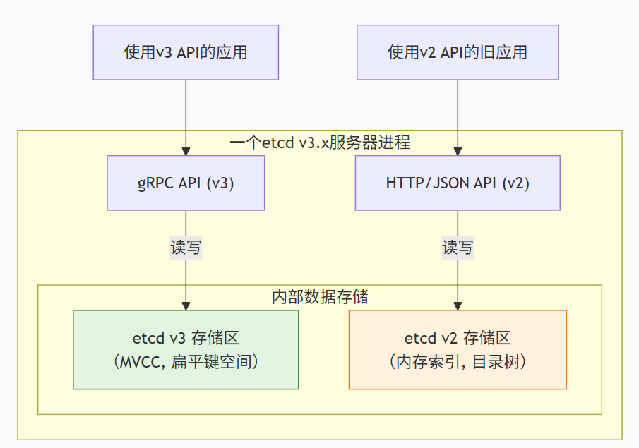 etcd 主要有v2和v3两个核心 API 版本,是迭代升级的两代接口,设计理念和底层实现差异显著,v3 为目前主流生产使用版本。