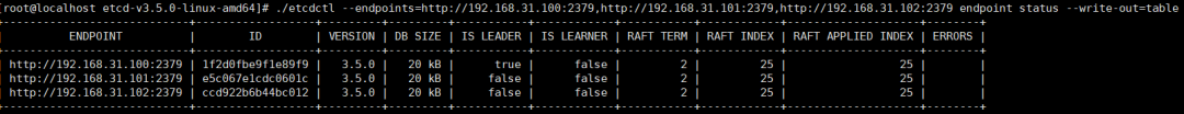 etcdctl --endpoints=http://192.168.31.100:2379,http://192.168.31.101:2379,http://192.168.31.102:2379 endpoint status --write-out=table