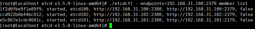 etcdctl --endpoints=192.168.31.100:2379 member list