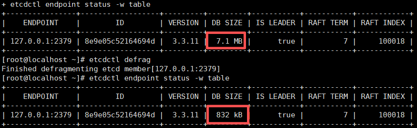 etcdctl compact压缩之前的所有历史版本(这个就是我们前面讲过的数据存储)。效果:BoltDB中产生大量空闲空间,dbSizeInUse(实际数据大小)显著下降,但dbSize(物理文件大小)不变——文件空洞形成。