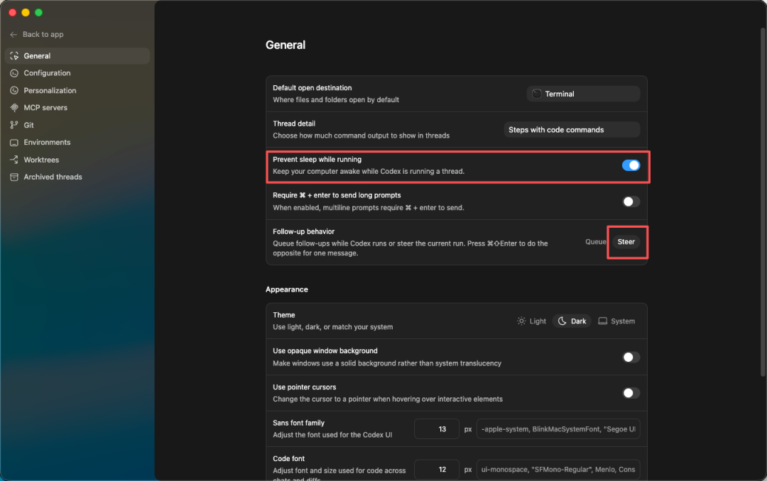 在General里,把保持电脑开机的开关打开,Follow-up behavior那个选项改成steer,这样你就可以在开发过程中,也随时给Codex发消息调整任务了。