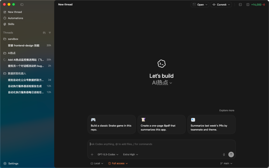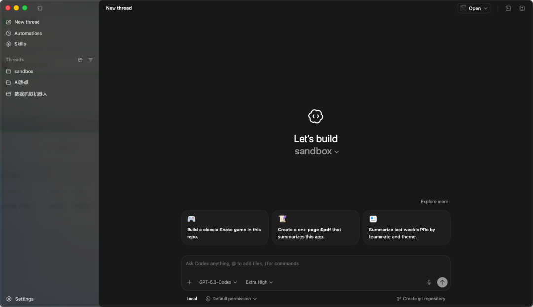 文件夹像一个项目群。 Thread像这个群里的一个具体话题贴。 你在某个话题贴里聊需求,Codex就在同一个上下文里改文件,跑命令,做记录,你换一个话题贴,它就切换到另一条任务线。