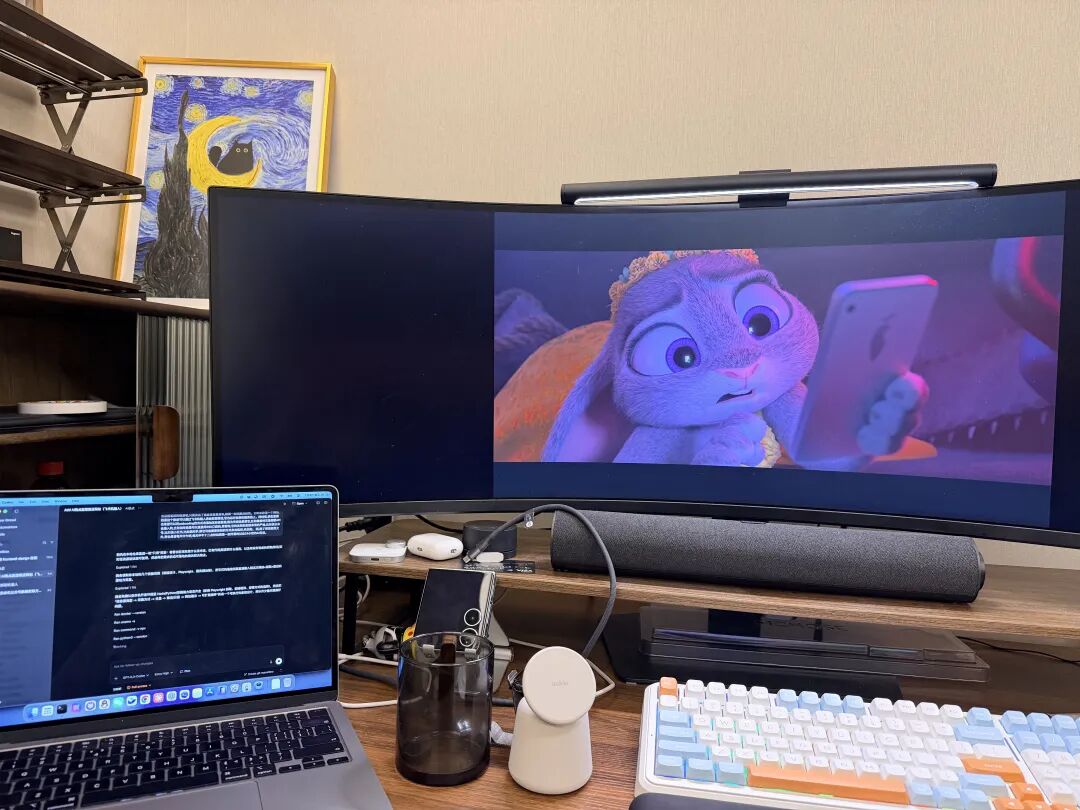 真的,左下角那个Macbook就是我用来Vibe Coding的电脑,大屏幕是我用的Windows主机在看电影。