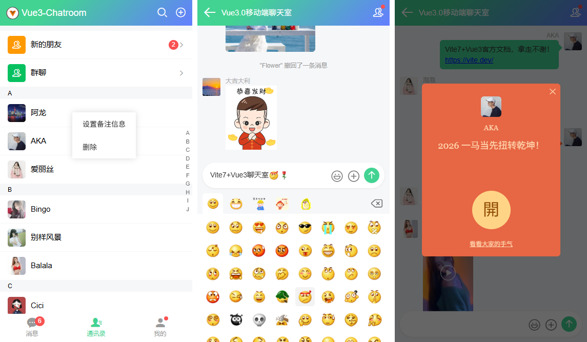 2026年重磅研发vite7+vue3+pinia3+vant4高颜值移动端仿微信界面聊天实例Vue3Chatroom。
