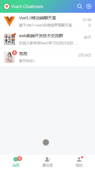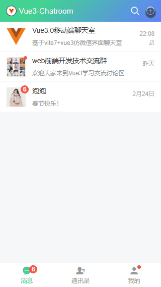 vite7-wechat包含聊天+通讯录+我的模块,支持图文消息/gif动图、图片/视频预览、红包/朋友圈等功能。
