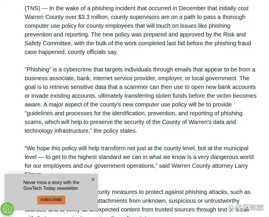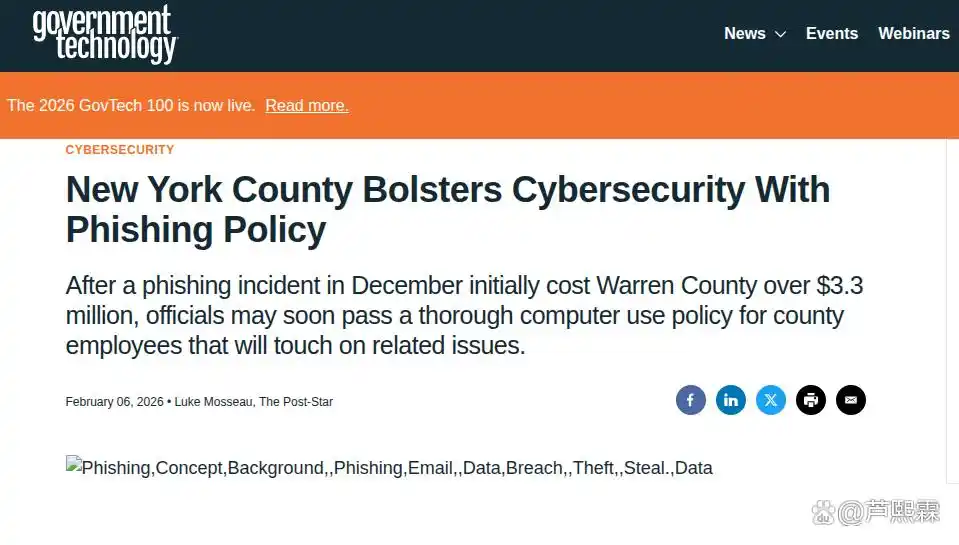 随着电子政务的深入推进,地方政府部门的业务流程高度依赖电子邮件、在线审批系统及数字化支付平台。这种数字化转型在提升行政效率的同时,也极大地扩展了网络攻击面。2025年12月发生在纽约州沃伦县的网络安全事件,成为了公共部门安全治理的一个转折点。据报道,攻击者通过精心构造的钓鱼邮件,成功诱骗财务人员执行了未经授权的资金转移操作,导致县政府直接经济损失超过330万美元。这一巨额损失不仅造成了财政缺口,更引发了公众对政府数据保护能力和财政管理严谨性的严重质疑。
