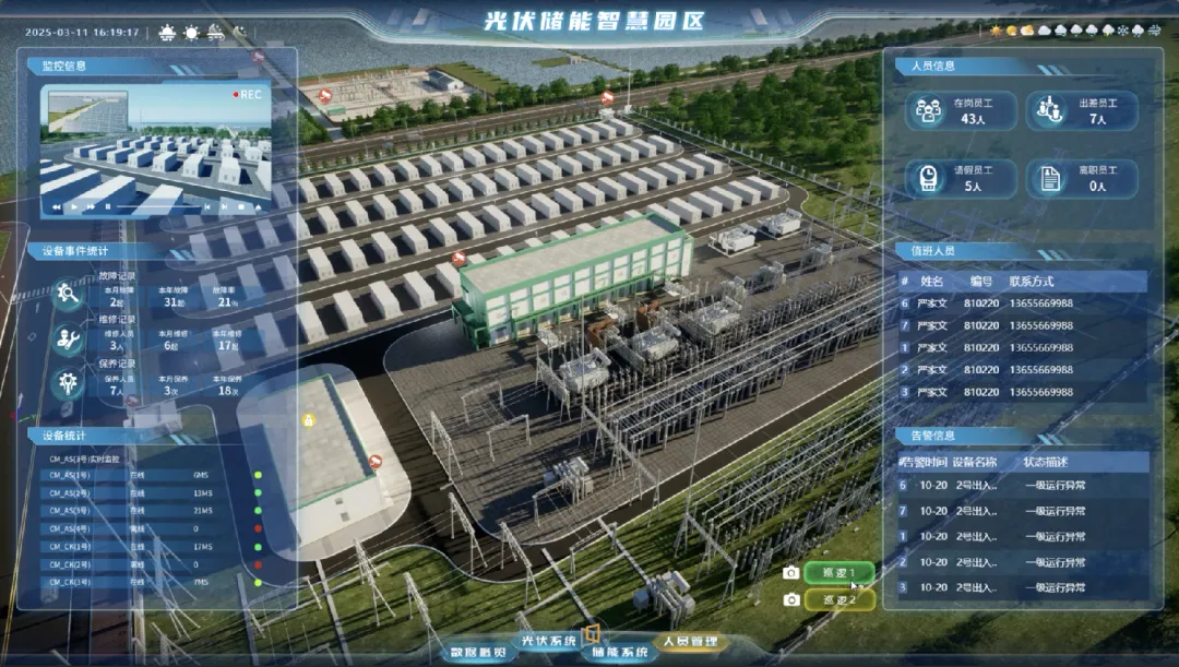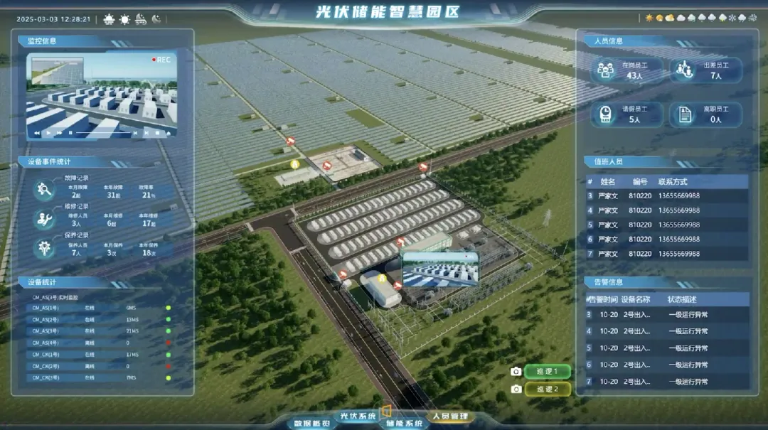 本平台是该企业光伏储能园区智慧运营的核心中枢,平台以高精度三维模型还原了园区内光伏阵列、储能集装箱、变配电设备、能量管理系统等关键设施,并实时接入气象数据、逆变器发电数据、电池状态、电网调度指令。通过三维可视化平台,运营者可总览从光伏发电、电能存储、智能调度到负荷消纳的全链路动态。支持发电功率预测、设备健康度评估、能效大数据分析、碳排精准核算,最终实现发电收益最大化、储能寿命最优化、运营决策智能化。