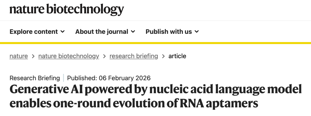 7. J. Zhang, Y. Zhang, Y. Wang, Generative AI powered by nucleic acid language model enables one-round evolution of RNA aptamers. Nat Biotechnol, (2026). doi: 10.1038/s41587-026-03008-4