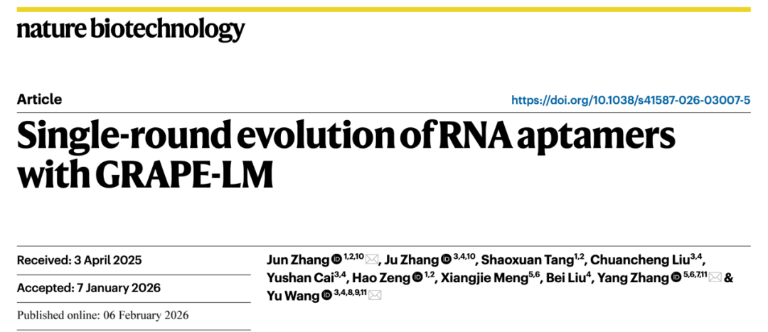 Zhang, J., Zhang, J., Tang, S. et al. Single-round evolution of RNA aptamers with GRAPE-LM. Nat Biotechnol (2026).
