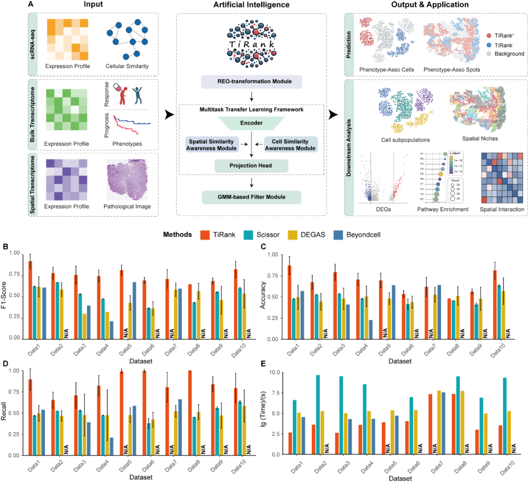 研究团队首先在多个公共基准数据集上对 TiRank 进行了测试 。在细胞系药物反应预测任务中,TiRank 在 F1 分数、准确率和召回率方面均显著优于现有的 Scissor、DEGAS 和 Beyondcell 等主流算法 。