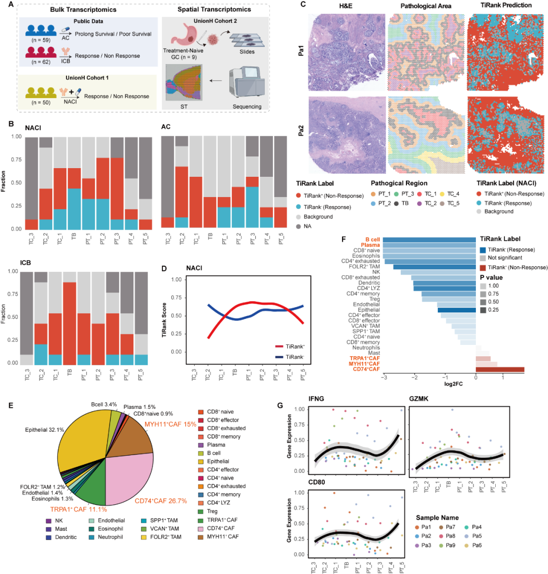 为了进一步探索 TiRank 在发现新型临床生物标志物方面的潜力,研究人员将其应用于胃癌(GC)队列 。胃癌患者对新辅助化疗免疫疗法(NACI)的预测性生物标志物此前尚不明确 。