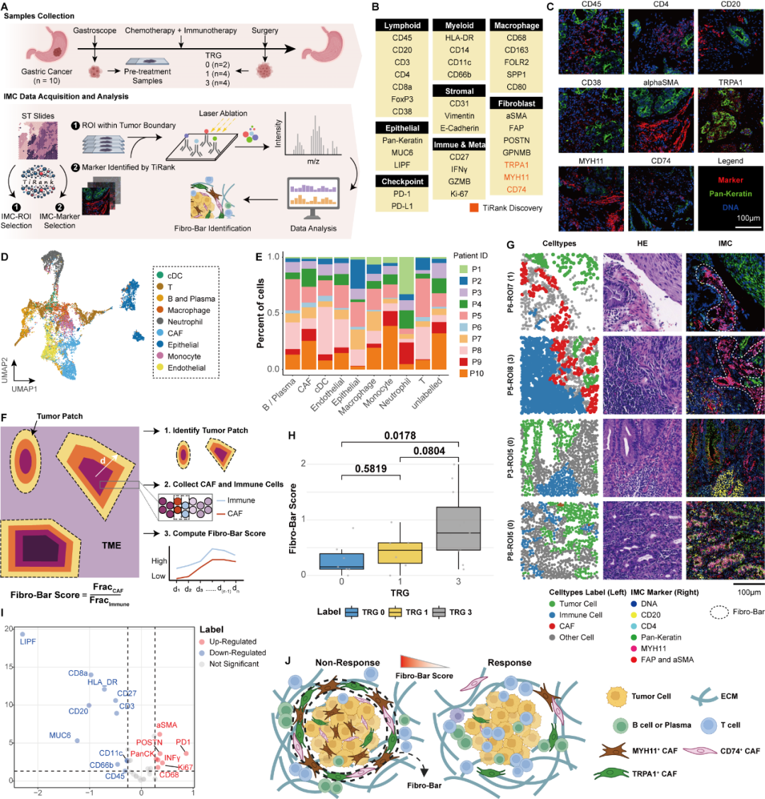 为了验证基于转录组学的发现,研究人员在另一个独立的胃癌患者队列中,利用多重蛋白质成像(IMC)技术对预处理的胃镜样本进行了空间蛋白质组学分析 。