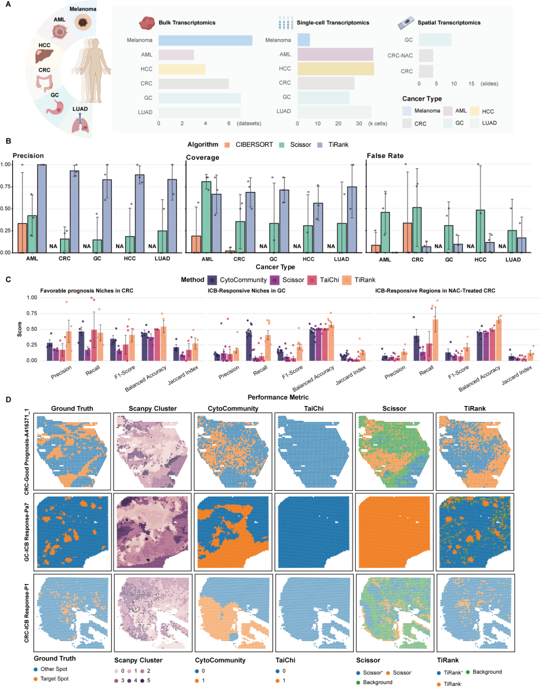 进一步地,在涵盖黑色素瘤、肺腺癌(LUAD)、肝细胞癌(HCC)、结直肠癌(CRC)和急性髓系白血病(AML)等多个临床队列中,TiRank 被证明能够高精度地识别与患者总体生存率和免疫检查点阻断(ICB)疗法反应高度相关的关键细胞亚群和空间生态位 。