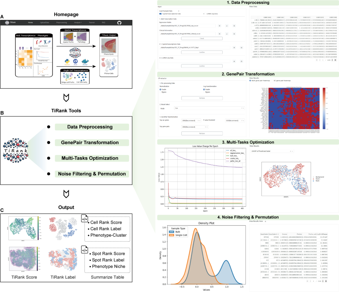 为了让该技术更容易被广大研究人员和临床医生使用,开发团队利用 Python Dash 框架将 TiRank 封装为一个具有交互式图形用户界面(GUI)的开源工具 。用户可以直接上传批量转录组学、scRNA-seq、ST 数据及临床表型,系统会自动完成数据预处理、基因对转换、多任务优化及噪声过滤,并最终输出直观的细胞/位点排名分数与表型生态位总结表 。