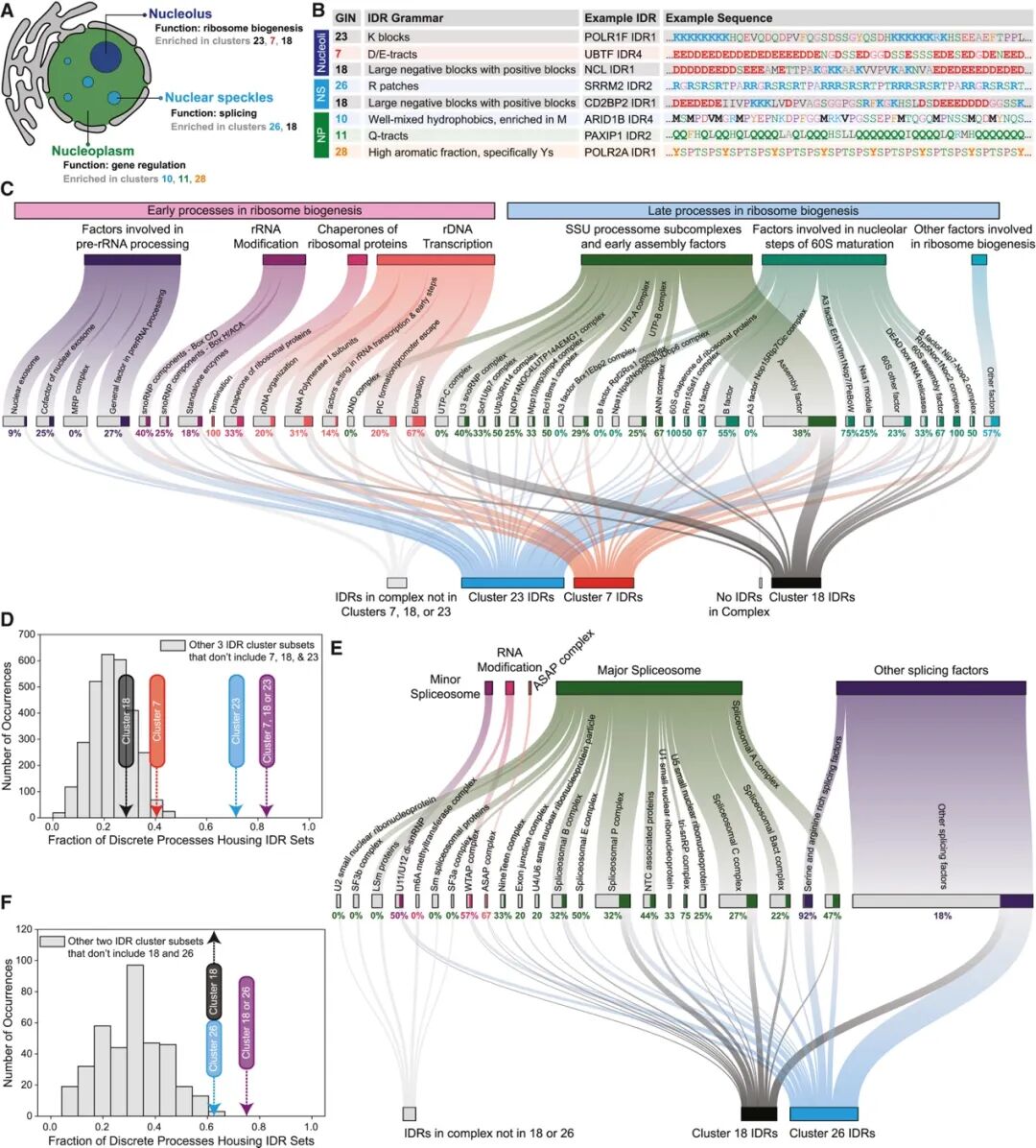 作者将视角聚焦于三个核内区域:核仁、核斑和核质,剖析了IDR语法如何参与这些区域内复杂生化过程的精细时空调控(图4A-B)。作者通过分析核糖体合成过程发现,Cluster 23 IDR (K-blocks)主要参与早期过程(如rDNA 转录、rRNA修饰);而Cluster 18 IDR则更多参与晚期组装过程(图4C-D),说明细胞通过IDR的电荷模式差异,将不同功能的蛋白分到核糖体组装过程中的不同位置。