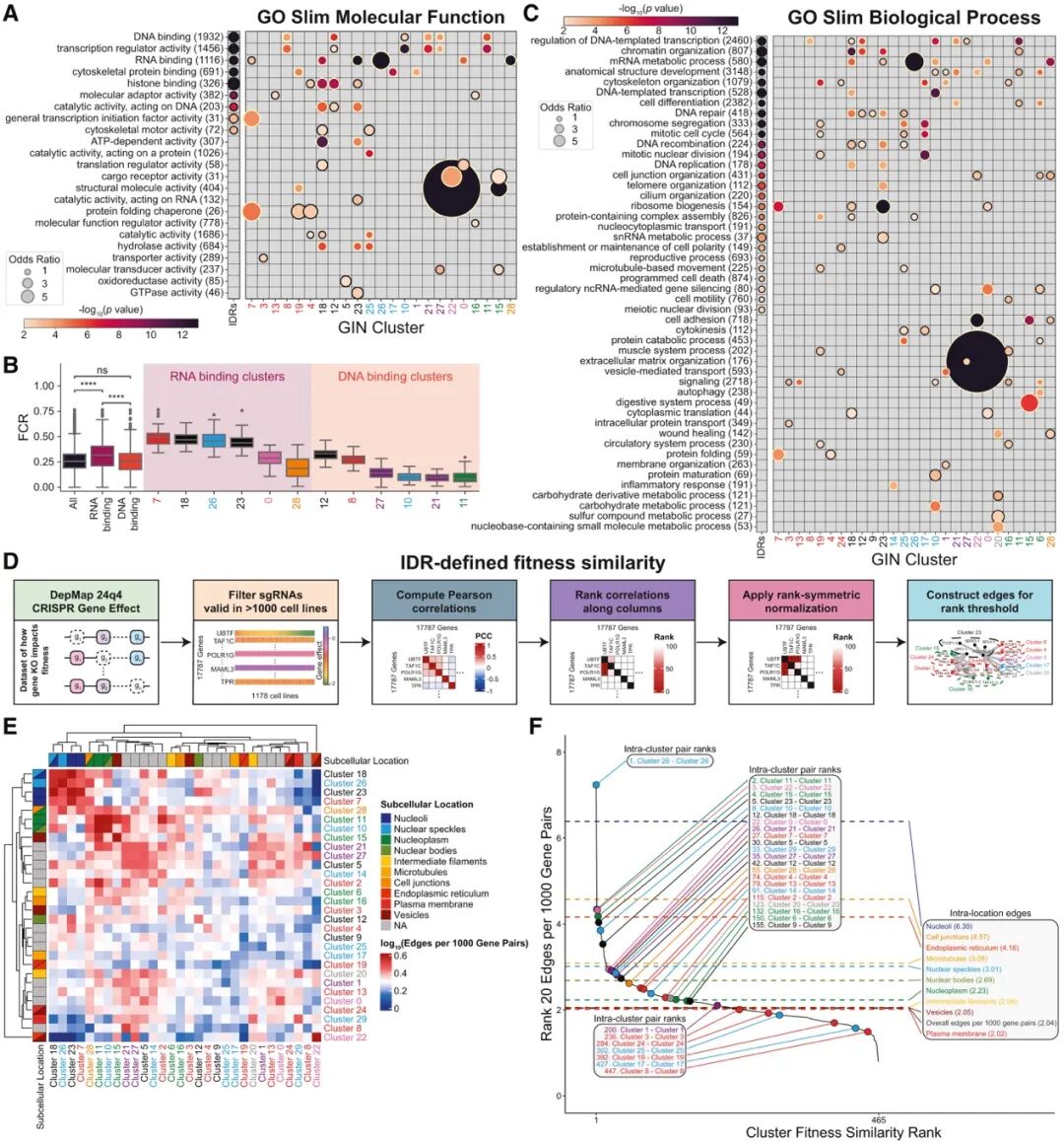 进一步,作者希望探究这些被分类的GIN聚类是否具有生物学意义。通过与人类蛋白质图谱(Human Protein Atlas, HPA)的数据进行交叉分析,他们发现特定的GIN聚类在特定的亚细胞结构中显著富集。作者将GIN cluster与Human Protein Atlas中的亚细胞定位数据进行整合分析(图2A),比较不同语法类型的IDR在核仁、核斑、核质等核内区室中的分布情况。结果显示,不同GIN cluster的IDR并非随机分布,而是对特定核内区室表现出显著偏好(图2B)。