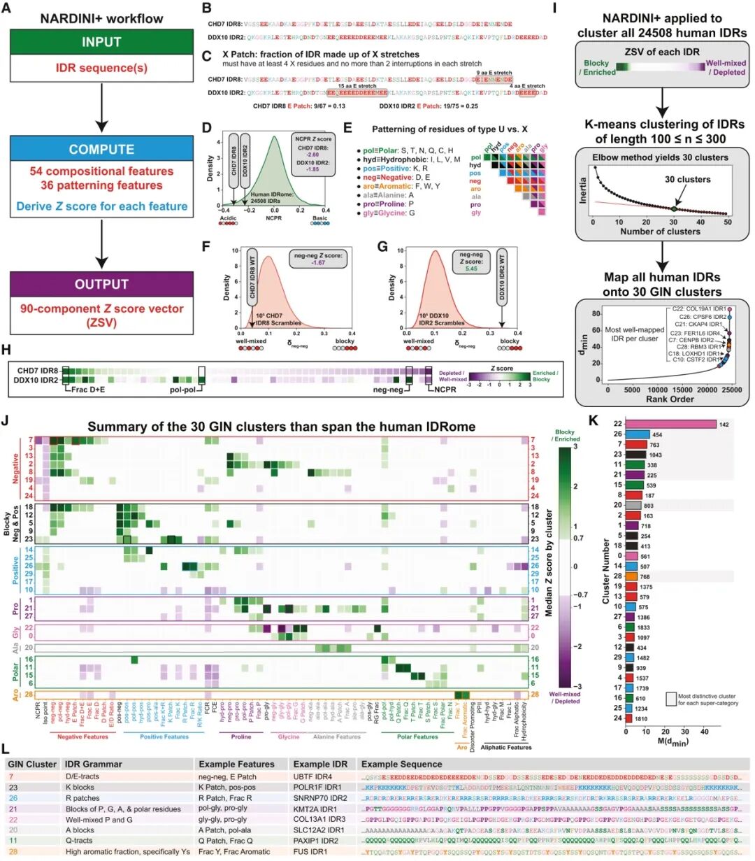 基于这些ZSV,作者对长度在100–300 aa之间的IDR进行无监督聚类分析,最终确定30 个聚类最能在复杂度与解释力之间取得平衡,并把他们被定义为GIN(Grammars Inferred using NARDINI+),代表覆盖整个人类IDRome的基本语法类型(图1I)。