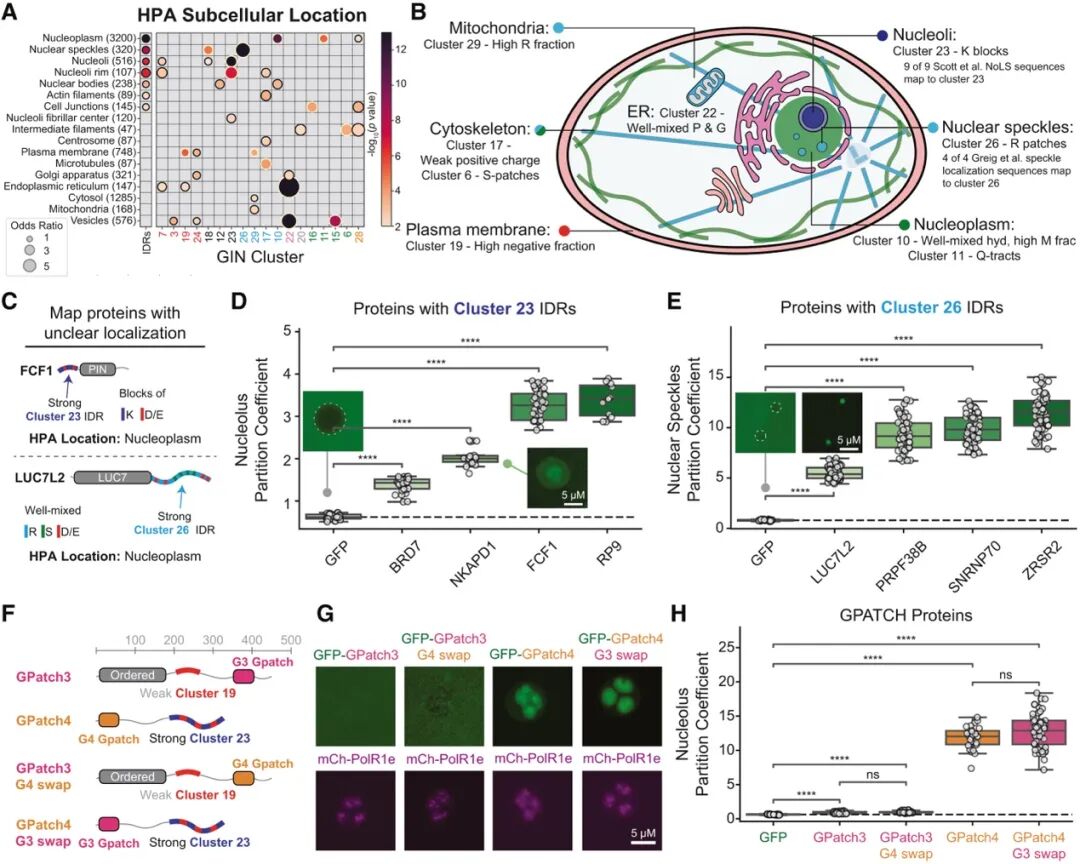 为了验证这种关联是否仅停留在统计层面,作者进一步在非洲爪蟾(Xenopus laevis)卵母细胞的生发泡(GV)体系中进行了成像实验(图2C)。他们选取了一些在HPA中定位信息模糊的蛋白质,仅根据其IDR所属的GIN聚类来预测其定位。实验结果显示,携带不同 IDR语法的荧光融合蛋白在核仁与核斑中的富集程度与其GIN归属高度一致(图2D-E)。