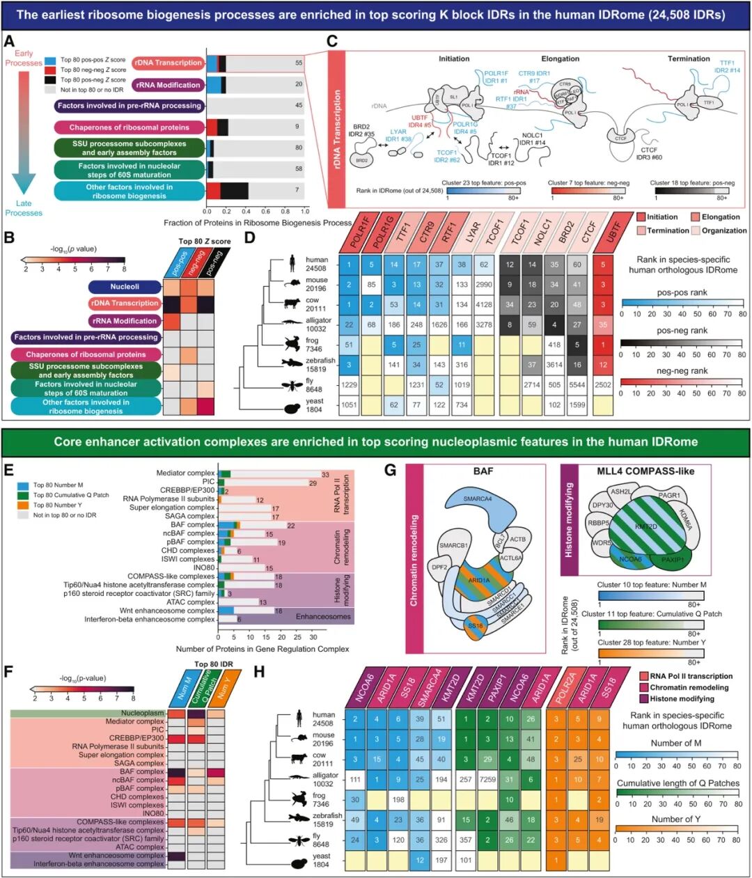作者统计了人类蛋白中IDR的数量分布,并将多IDR蛋白中各个IDR的GIN归属进行组合分析(图5A)。在核糖体 DNA (rDNA) 转录的起始、延伸和终止阶段,关键蛋白(如 POLR1F, UBTF)含有极其显著的Cluster 23 (Pos-Pos Z score 极高) 特征(图5B)。进化树分析显示,这些极端的语法特征在亿万年的进化中被保留了(图5C-D)。这些“极端”IDR是相分离和招募特定伙伴的关键驱动力(图5E-H)。