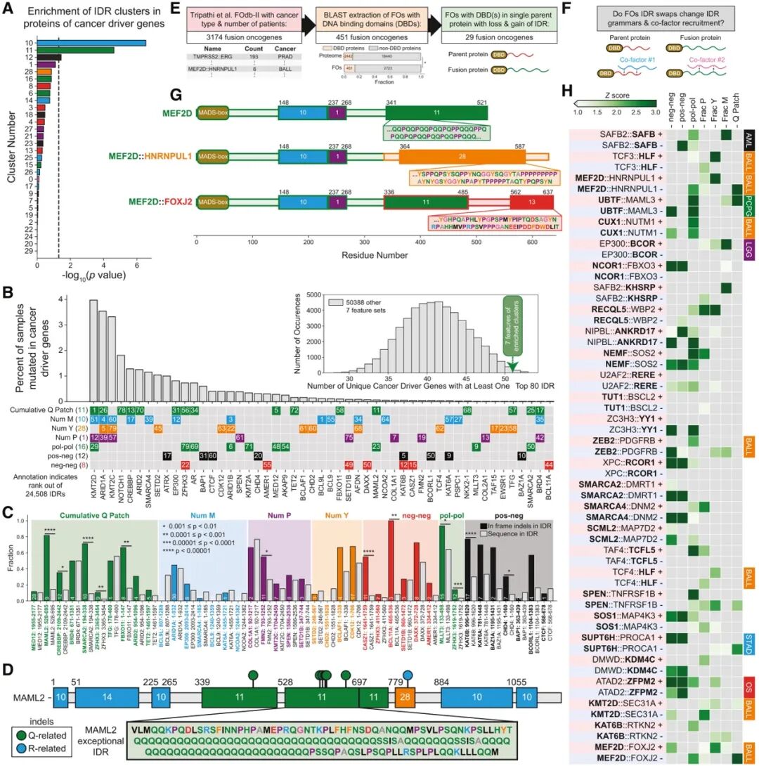 作者在最后使用IDR的语法证明IDR的语法错误和疾病发生相关。研究者统计发现有超过50个致癌基因含有全基因组Top 80的“极端”IDR。这暗示了维持这些极端语法的完整性对细胞健康至关重要(图7A-B)。在那些具有“块状电荷”特征的IDR中,插入/缺失突变 (Indels) 的发生率异常高。例如MAML2蛋白,其IDR原本拥有极长的Poly-Q序列,但在林奇综合征相关肿瘤中,这段Q区域经常发生缺失,导致相互作用价态改变(图7C-D)。除此之外,染色体易位产生的融合癌蛋白(Fusion Oncoproteins, FOs)经常发生IDR替换,比如MEF2D融合蛋白,原本的IDR被换成了另一个蛋白的IDR。这种“语法交换”会导致蛋白招募错误的合作伙伴(Co-factors),从而导致基因表达失调,引发癌症(如白血病)(图7E-H)。