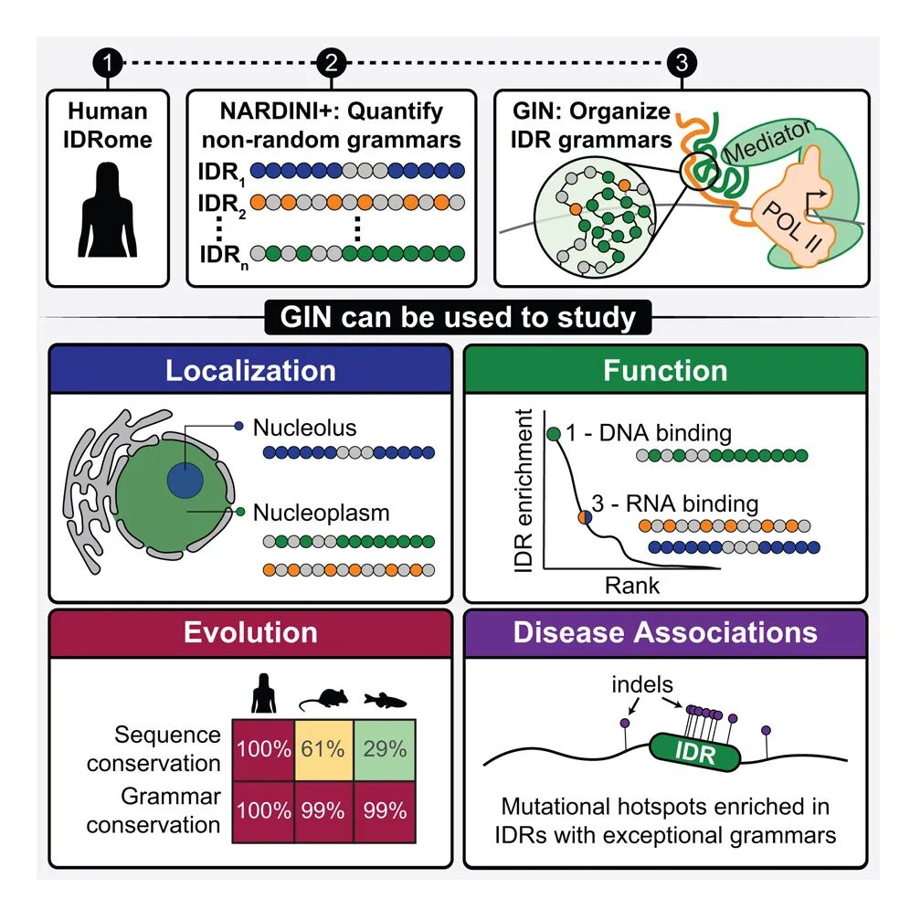 总的来说,这项研究的核心贡献在于利用NARDINI+算法构建了GIN资源库,通过量化氨基酸组成和非随机排列模式,将人类蛋白质组中的预测IDR系统地划分为30个独特的分子语法簇。该方法目前聚焦于“标准状态”下的IDR序列特征,虽暂未纳入翻译后修饰或细胞内环境因素,但研究者提供了开放的Google Colab工具支持用户进行自定义序列分析。作为一种无需依赖复杂构象系综模拟即可预测序列-功能关系的高效计算策略,该方法与现有的进化分析手段互补,为全蛋白质组范围内的IDR功能研究提供了新的理论框架和工具。