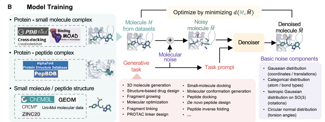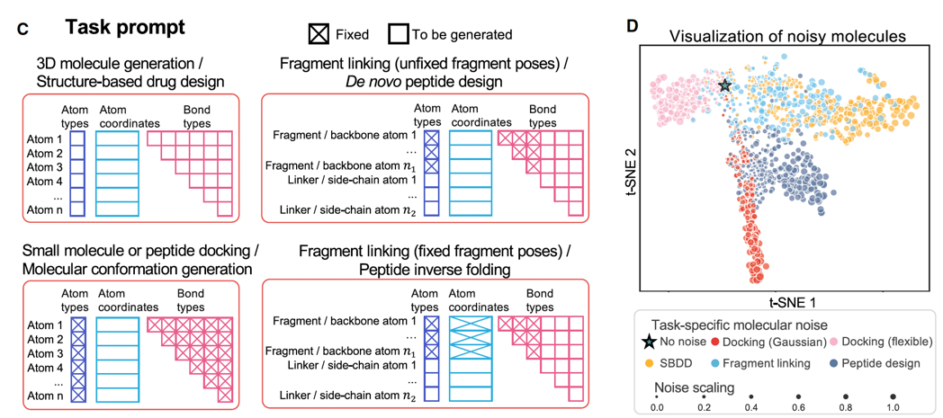 但统一表达还不够。不同任务在物理层面的约束差异也很明显。Docking、de novo 生成、片段生长,它们的构象自由度和噪声模式完全不同。