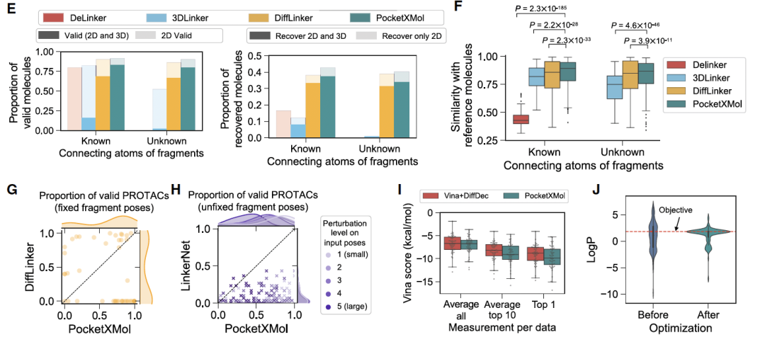 在 fragment linking 和 fragment growing 任务中,模型需要在“部分结构已知”的情况下补全剩余部分。这里的难点在于:既不能破坏固定片段的结构,又要保证连接部分在化学与几何上合理。结果显示,无论在已知片段姿态还是姿态扰动的情况下,PocketXMol都能保持较高的有效率与结构相似度。这与前面讲到的“任务特异噪声机制”是呼应的——统一框架并没有抹平不同任务的物理约束,反而通过统一表示让模型学到更稳健的结构规律。