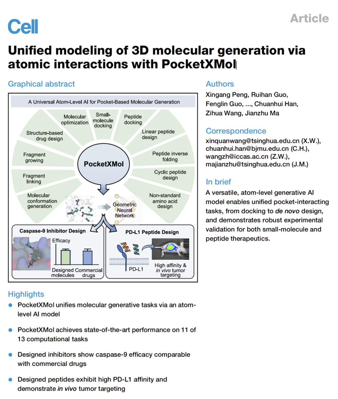Peng, Xingang, Ruihan Guo, Fenglin Guo, Ziyi Wang, Jiayu Sun, Jiaqi Guan, Yinjun Jia et al. "Unified modeling of 3D molecular generation via atomic interactions with PocketXMol." Cell (2026).