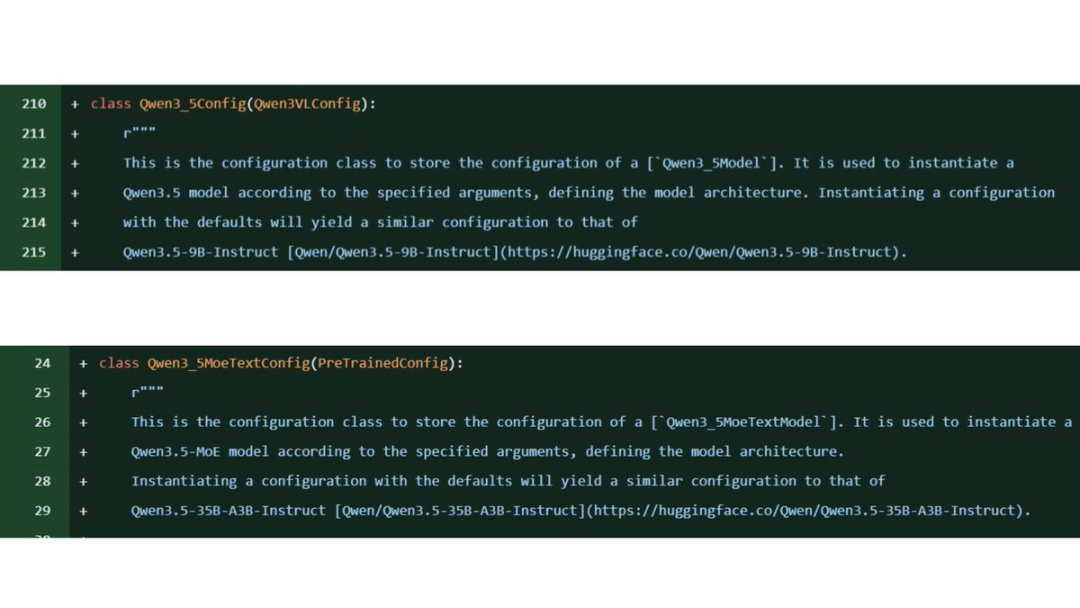 与之呼应的是,GitHub 上的 transformers 库中也悄然出现了 Qwen 3.5 的配置文件: