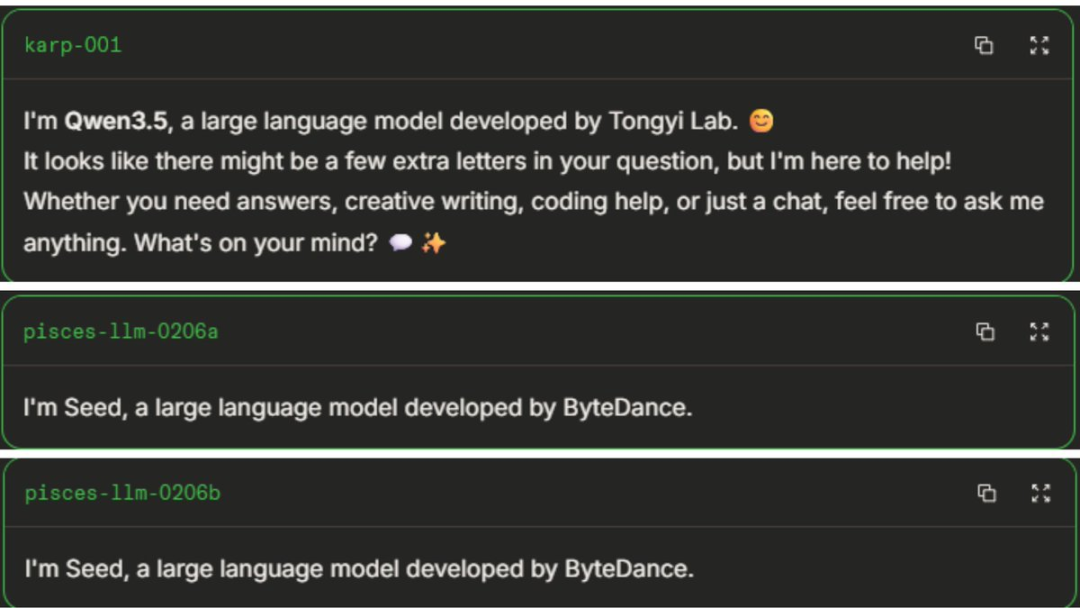 在 Arena 上,代号为 Karp-001 和 Karp-002 的模型,在被问及身份时,明确回答自己是 Qwen 3.5(阿里通义千问的下一代大版本)。
