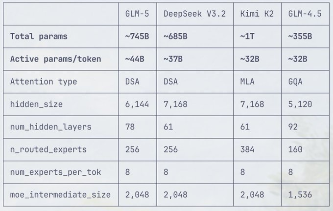 这意味着 GLM-5 属于 MoE(混合专家)架构,基于 DeepSeek-V3.2 的 DSA 技术路线。
