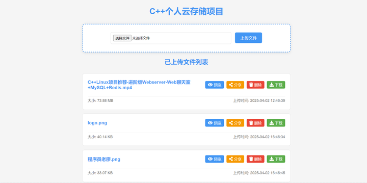 视频讲解及源码领取:C++云存储项目(可写简历)-支持注册-登录-分享文件-预览视频和图片