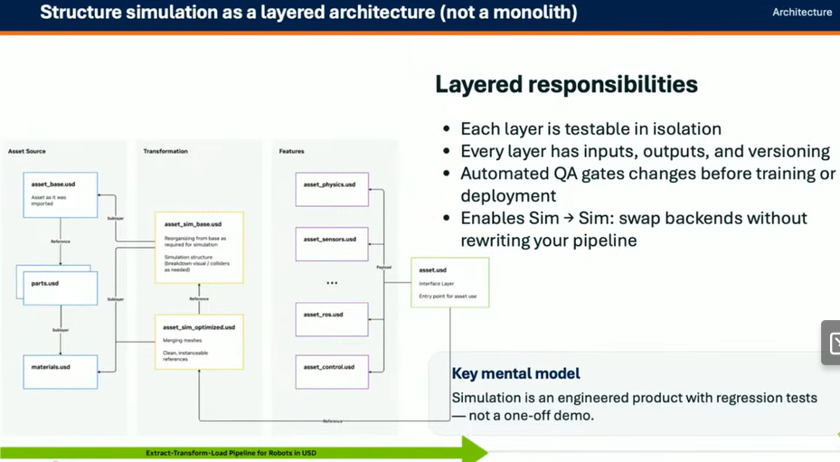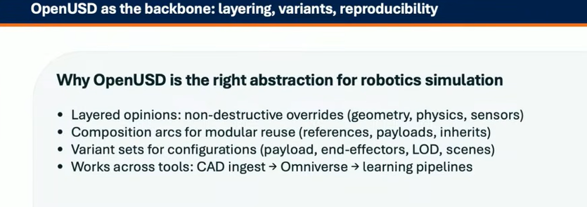 OpenUSD作为开放标准,为解决这个问题提供了新的途径。它的分层架构允许将CAD模型的完整物理属性保留到仿真环节,而不需要在转换过程中丢失信息。每个图层可以独立存储材质、物理参数、传感器配置等数据,这些图层之间还能相互影响,形成完整的物理模型。