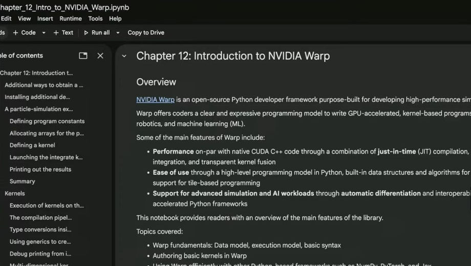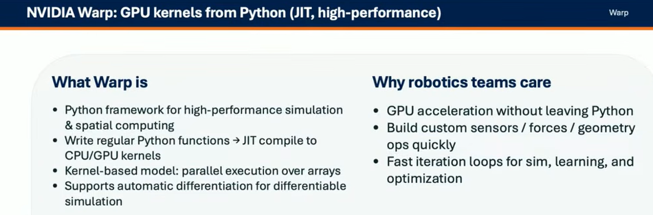重要的是,Warp使用Python编写,降低了实验的门槛。当概念验证完成后,代码可以转换为C++或Rust以提升生产环境的性能。这种渐进式的开发路径让研究人员能够快速迭代想法,同时保证最终部署的效率。