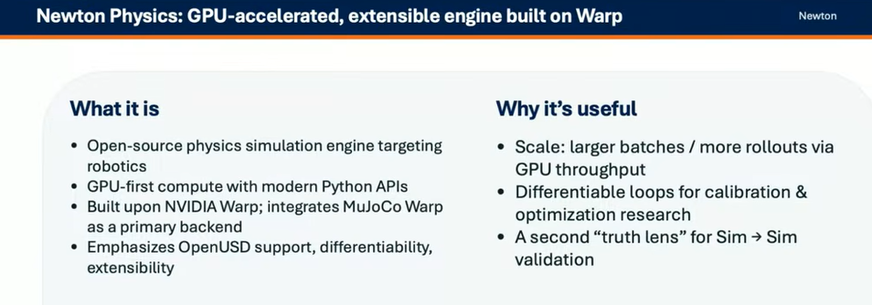 不同的物理引擎适用于不同的开发阶段。PhysX提供高保真度的渲染和碰撞检测,适合在Isaac Sim中进行完整的场景仿真。而NVIDIA Warp和Newton Viewer则专注于快速的物理计算,能在GPU上并行运行大量实验,更适合强化学习的训练阶段。