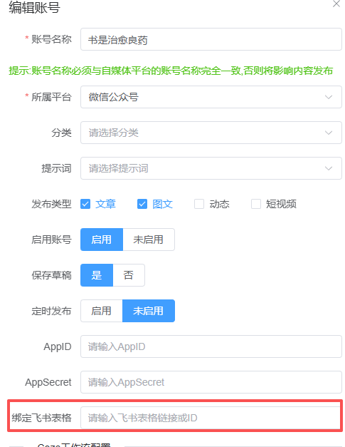 接下来是关键一步:绑定飞书表格。把第一步获取到的表格链接填进去,保存。 这就意味着,这个账号后续所有的内容生成和发布,都会读取这张表格的数据。