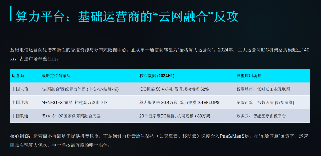 他们的核心壁垒在于光纤网络和土地资源,特别是在"东数西算"八大枢纽节点上,运营商几乎垄断了优质地段。