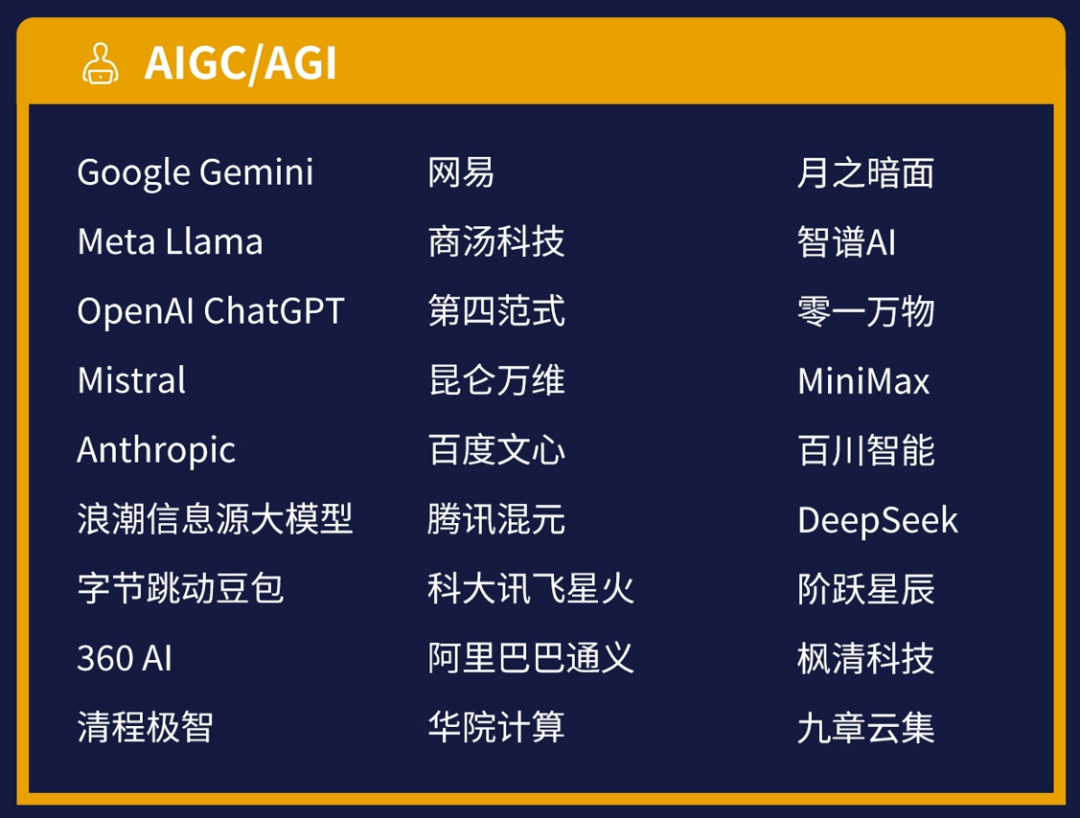 应用层是这份报告另一个亮点。大模型赛道,国际上的OpenAI、Google、Anthropic、Meta、Mistral、xAI、Stability AI、Cohere,国内的百度文心、阿里通义、腾讯混元、华为盘古、DeepSeek、商汤日日新、科大讯飞星火、智谱AI、月之暗面Kimi、MiniMax、百川智能、零一万物、阶跃星辰等,几乎把市面上所有有头有脸的模型厂商都囊括在内。更重要的是,报告还细分了垂直领域的突破者,比如商汤在医疗大模型、第四范式在金融决策、科大讯飞在语音交互等,这种细分对寻找差异化投资机会很关键。