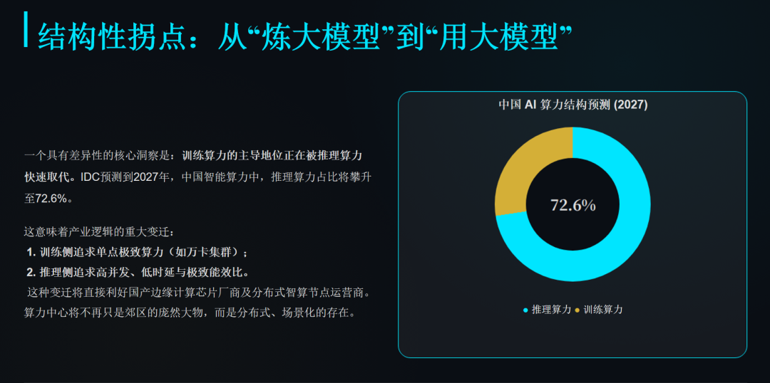 值得注意的是,算力需求结构正在发生根本转变。大模型训练过程中70%开销在算力,但推理阶段这一比例高达95%。随着AI应用落地,推理算力需求正在快速超过训练算力。IDC预测到2027年,推理算力占比将从当前不足30%升至72.6%。这意味着硬件架构需要从"训练优化"(高吞吐、大显存)向"推理优化"(低延迟、高能效)切换,存量训练卡资产面临技术折旧风险。