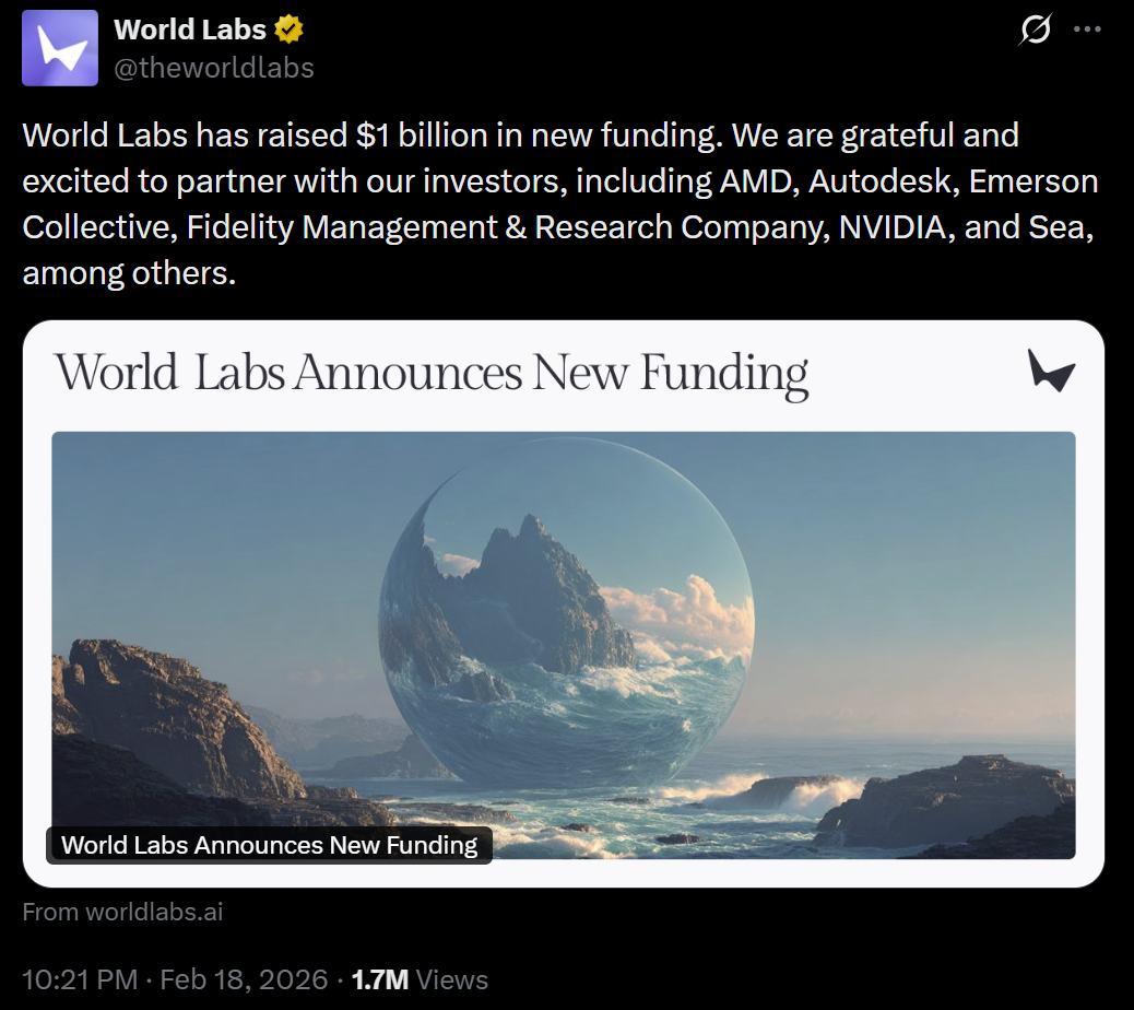 这句话在2026年2月得到资本市场最强烈的回应。李飞飞的World Labs官宣10亿美元新融资,估值冲破50亿美金——从10亿到50亿,这家公司只用了不到2年。 Anthropic达到同等估值花了25个月,而World Labs更快。