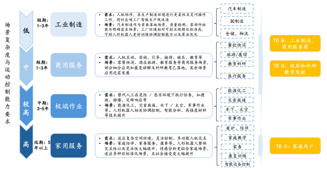 应用场景呈现"工业先行、商用跟进、家用终局"的三阶段路径。
