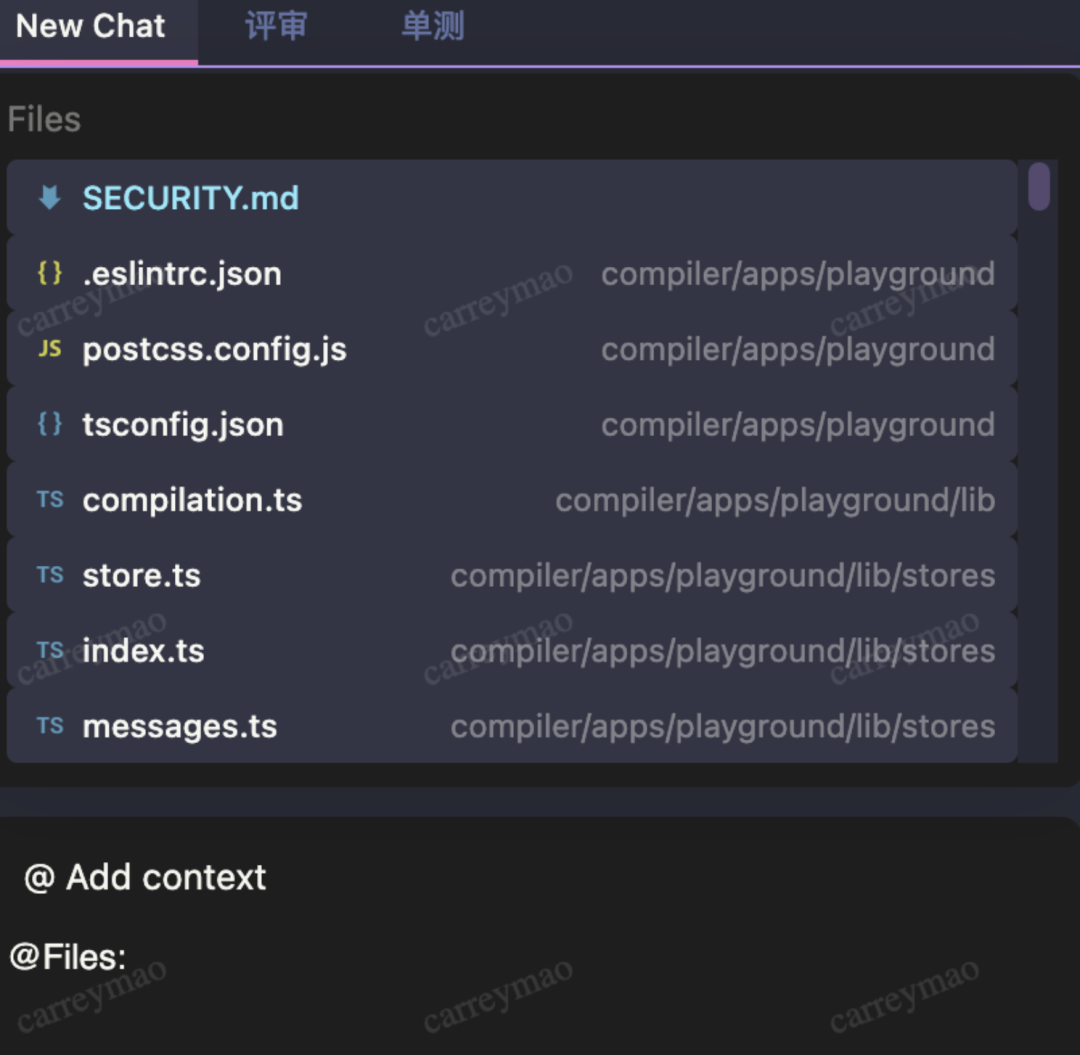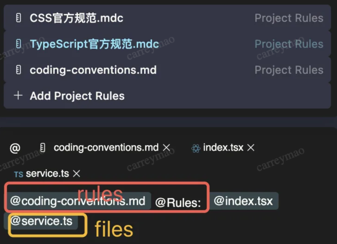 如下图所示,在对话最开始手动引入rules,和files,再开始其他提示词。