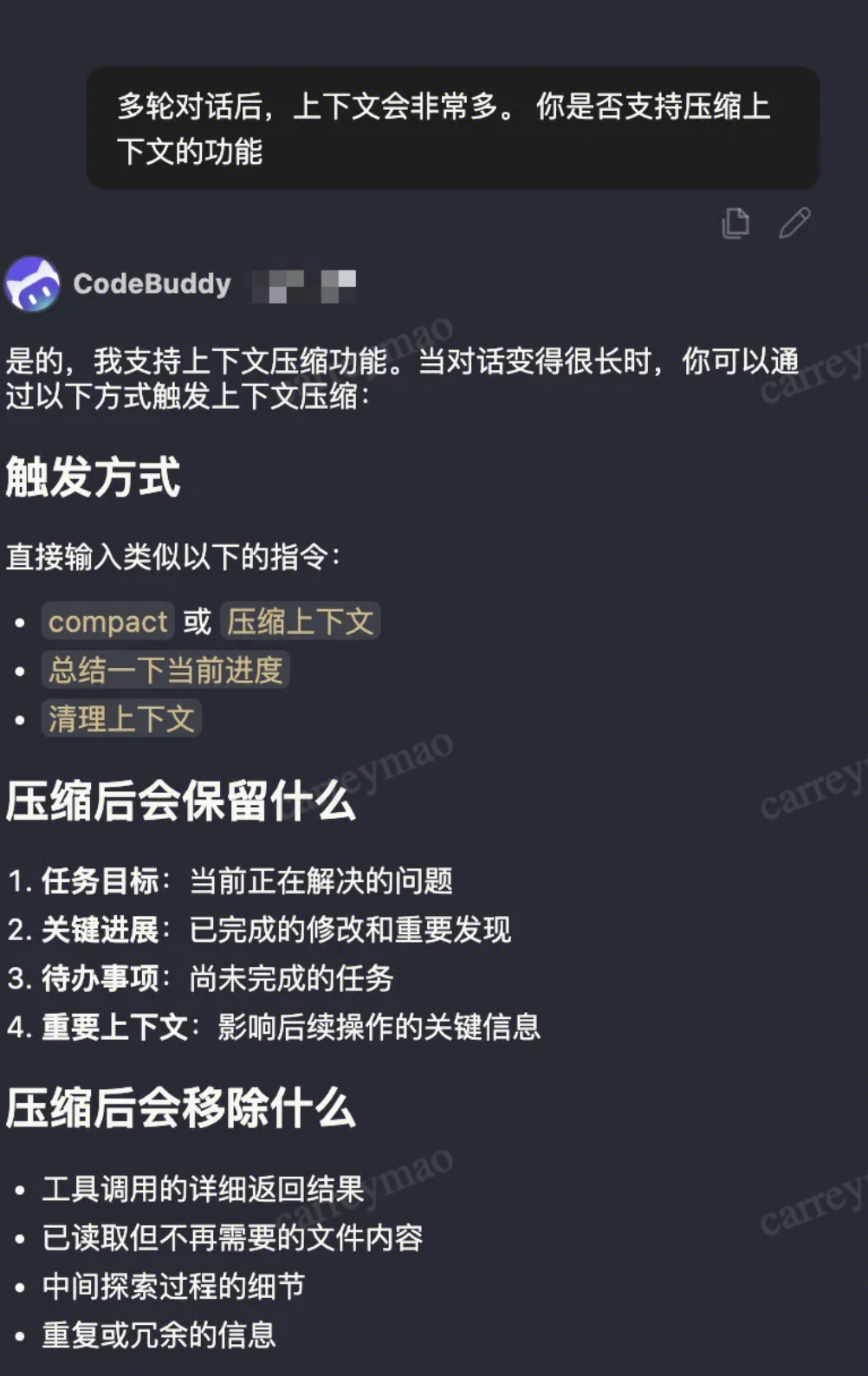 如果真的有一个需求特别大,无法做拆分,经过了很多轮对话,我们可以使用压缩上下文的功能。每个模型可能具体的说法不同。这里可以先问模型要一个“总结并压缩上下文”的 Prompt。