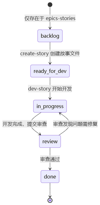 • backlog:故事仅存在于 epics-stories,尚未创建独立故事文件