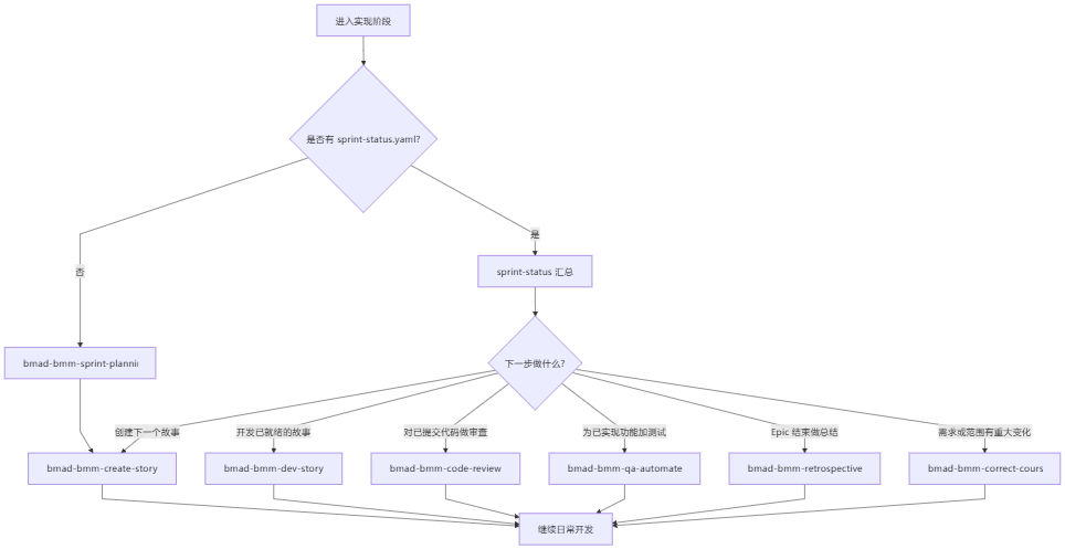 不确定下一步该运行哪个命令时,可先运行 bmad-bmm-sprint-status 查看汇总与建议;也可按下图选择。