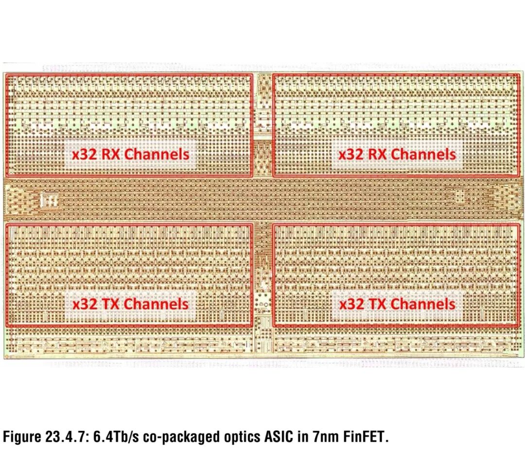 该CPO ASIC采用7nm FinFET工艺制造(图23.4.7),单片裸片集成64条发射/接收通道、TXPLL、辅助公共电路及ADC/DAC组件;6.4Tb/s光引擎通过7nm ASIC与PIC硅片的3D封装实现,多个光引擎与主机网络ASIC共封装以支持可扩展吞吐量。